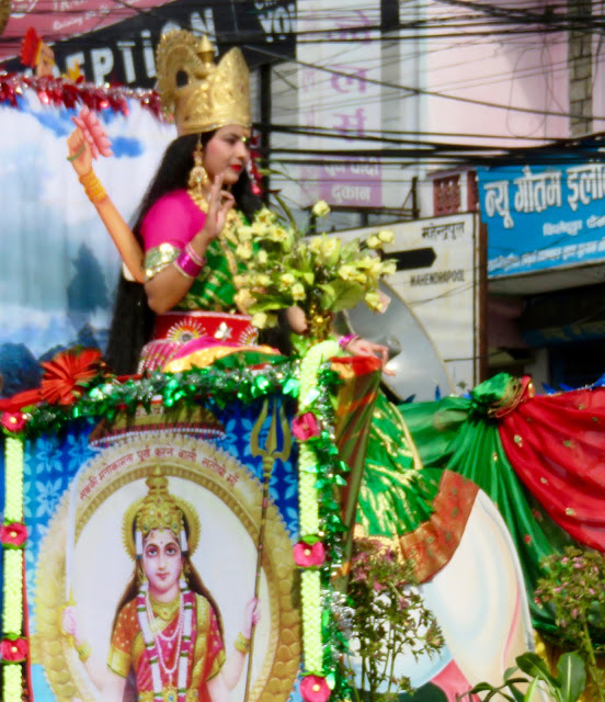 I had partially scoped out the route the day before and thought I knew it. Wrong again! I missed the turn, and we ran into totally strange territory in the middle of Old Pokhara. As I was struggling along, trying to make a decision as to where to go, what do we run into but a parade!